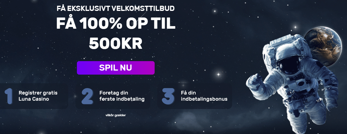 Hos Luna Casino bliver man som ny kunde mødt af en velkomstbonus på op til 500 kr. Bemærk dog at det kan være man ikke er kvalificeret til bonussen hvis man allerede har spillet på deres øvrige brands. Man skal omsætte indbetaling + bonus X10 og man må maksimalt spille 50 kr. bare spin i mens man har bonus tilknyttet.