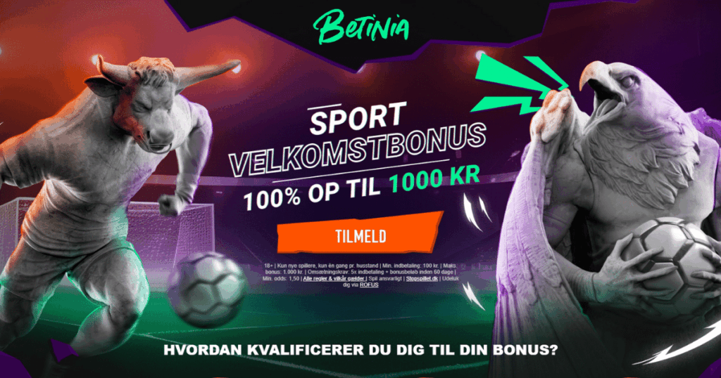 Kom i gang med Betinia i dag! Betinia tilbyder ikke bare en stærk velkomstbonus, men også en førsteklasses betting oplevelse med funktioner som tidlig udbetaling og adgang til nichemarkeder. Samtidig har de loyalitetsprogram hvor du optjener point, jo mere du spiller. Så løbende kan du låse op for freebets, kontante præmier og meget mere.