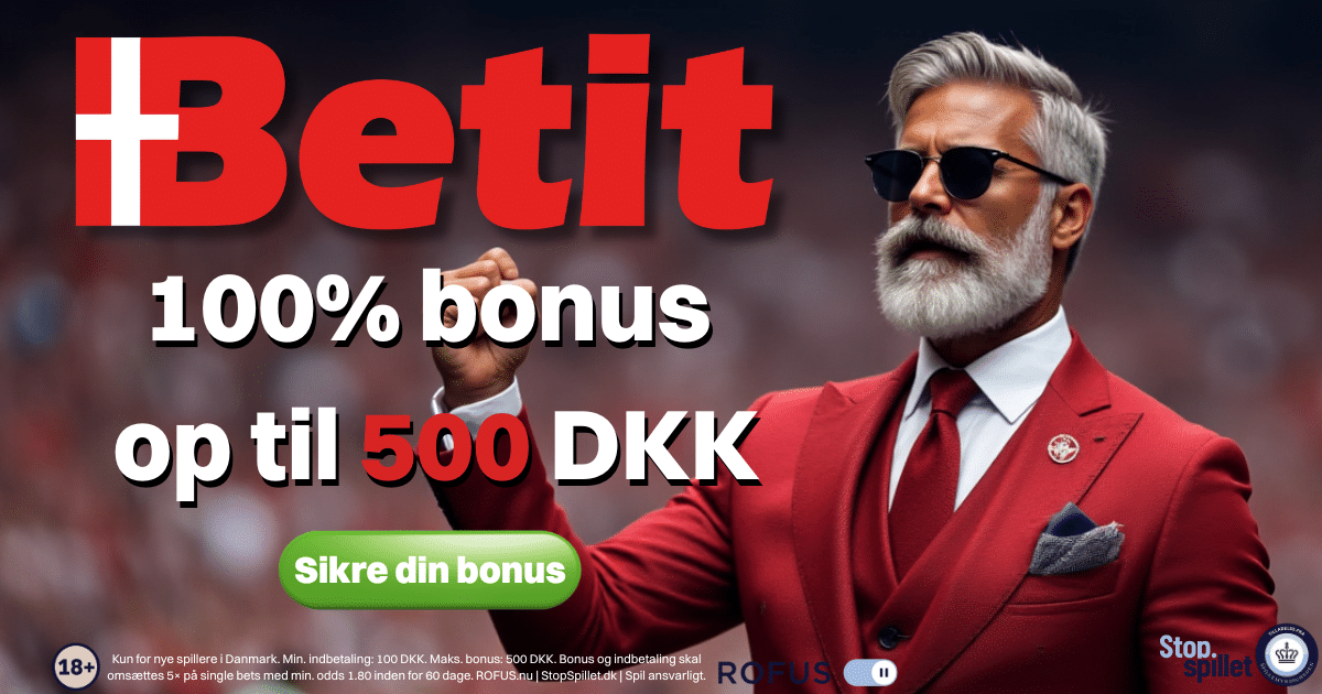 Min. +18 år • Hjælpelinje: StopSpillet.dk • Selvudelukkelse via ROFUS.nu • Regler og vilkår gælder • Min. indbetaling 100 kr. • Max bonus: 500 kr. • Omsætningskrav 5x indbetalings- og bonusbeløb • Eksempel: Indbetal 500 kr. og modtag 500 kr. i bonus (omsætning 5x 1000 kr. = 5000 kr.) • Min. odds 1,80 • Gyldig i 60 dage.