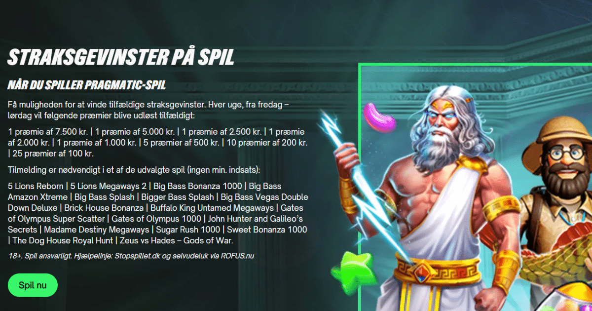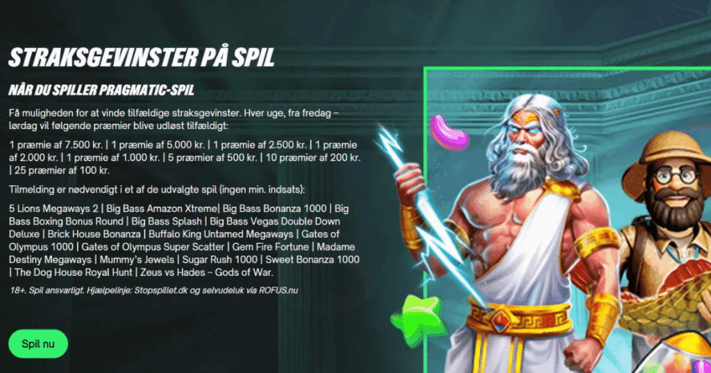 Der er hver weekend en samlet præmiepulje på 25.000 kr. og du kan opleve at modtage en straksgevinst mens du spiller.