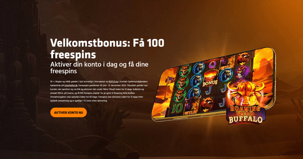 Min. +18 år • Hjælpelinje: StopSpillet.dk • Selvudelukkelse via ROFUS.nu • Regler og vilkår gælder • Expekt T&C • Kampagne gældende 20. juni – 31. december 2025. Tilbuddet gælder nye kunder, der opretter sig via link og aktiverer det under ‘Mine Tilbud’ inden for 31 dage. Indbetal og omsæt 100 kr. på Casino, og få 100 freespins (værdi 1 kr. pr spin) til Roaming Wild Buffalo. Omsætningskrav skal opfyldes inden for 60 dage. Freespins skal aktiveres inden for 31 dage efter opfyldt omsætning og er gyldige i 72 timer efter aktivering.