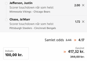 Expekt har delt flere enormt gode oddsboost til NFL runden i dag. Dette boost jeg spiller, er et boost på touchdowns fra 2 af ligaens nok bedste receviers, Jefferson og Chase! Begge er deres holds klare WR1 og får enormt mange targets.